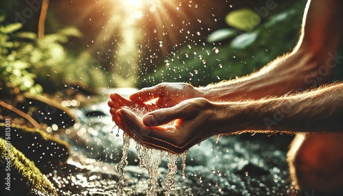hands cupped together, catching droplets of water in motion. The background should be a blurred nature scene with soft, natural light filtering through. Generative AI