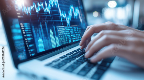 Hands engaged in typing on a laptop, intricate stock market analysis charts illuminated on the screen, showcasing financial strategy and insight