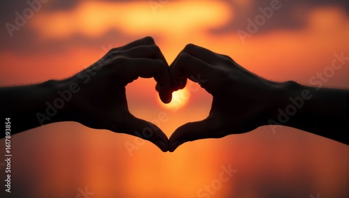 Hands forming a heart shape silhouette against a vibrant sunset sky