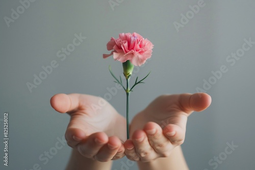 Hands Gently Holding a Pink Carnation Flower, Symbolizing Care, Love, and Delicacy Against a Soft Background.