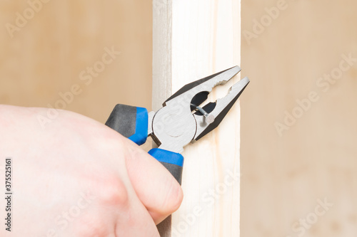 hands hold a wooden block and pull a nail out of it using pliers, close-up
