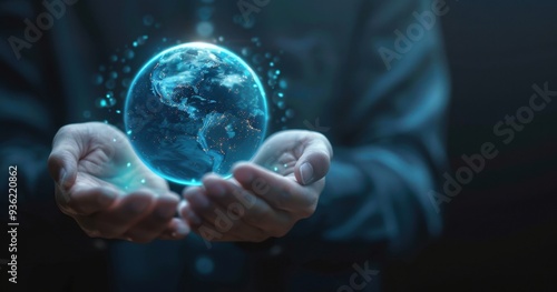 Hands holding a glowing Earth hologram, a digital world concept background with a copy space area for text and design Generative AI