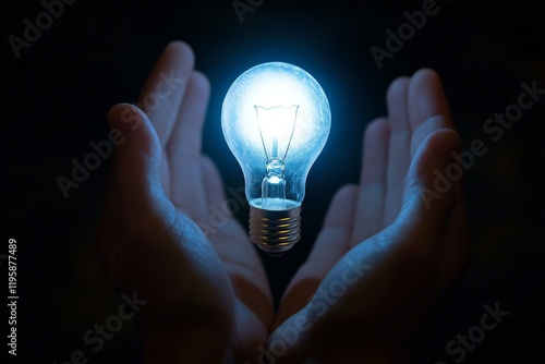 Hands holding a glowing lightbulb in the dark symbolizing innovation creativity and the spark of new ideas with a focus on contrast and modern technology themes