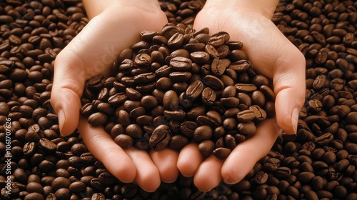 Hands holding a pile of coffee beans with the background blurred, creating a sense of aroma and warmth. Beans look freshly roasted and oily.