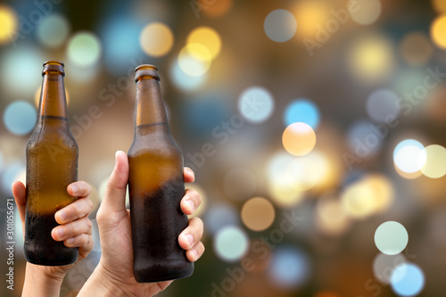 Hands holding beer bottles and happy enjoying harvest time together to clinking glasses at outdoor party on beautiful bokeh night light background.Celebration drinking beer in pub orbar.