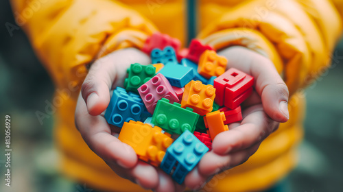 Hands holding colorful toy plastic bricks, and blocks for building toys