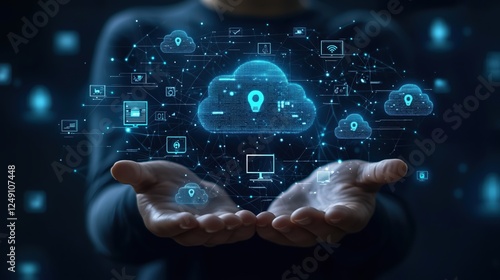 Hands Holding Digital Cloud with Floating Icons Representing Technology, Networking, Data Storage, and Connectivity in a Virtual Space
