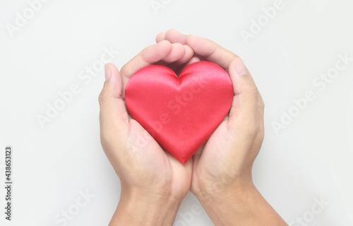 Hands holding red heart. heart health donation concepts