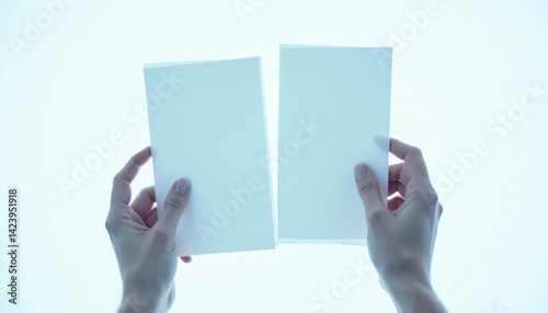 Hands holding two blank sheets of paper against a bright background, symbolizing creativity and ideas
