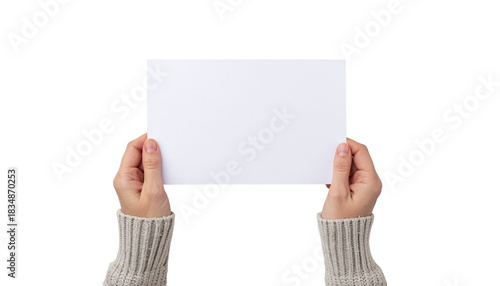 Hands in a sweater holding a blank white rectangular card against a white background for message or design placement product shot isolated