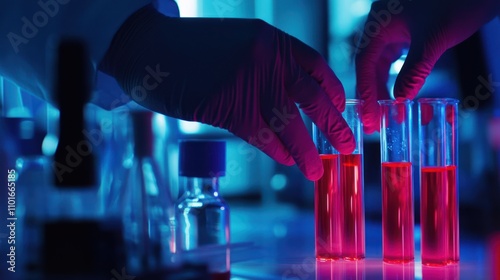 Hands in Gloves Holding Test Tubes with Red Liquid in a Laboratory