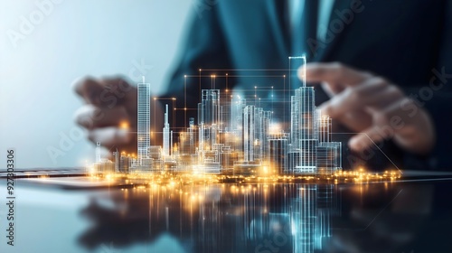 hands interacting with futuristic digital city model with glowing skyscrapers