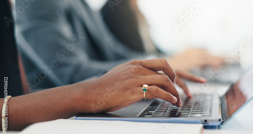 Hands, laptop and typing at office with communication, team or project management at corporate agency. Person, computer and keyboard with review, feedback and editing proposal at insurance company