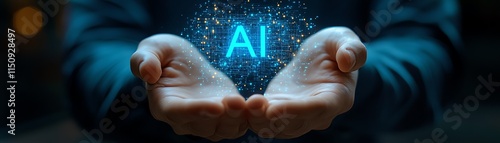 Hands of a businessman with a digital AI icon, illustrating artificial intelligence in business, online data networks, and technological advancements