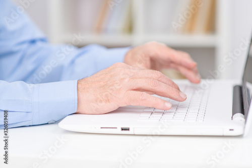 Hands of a senior lying on the keyboard of a white laptop on the background of shelving with books