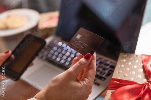 Hands of woman holding credit card and smart phone by Christmas present at home