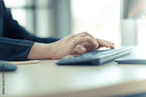 Hands of young businessman is typing on keyboard while sitting by table in front of computer