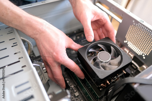 hands of young male master install cooler with copper heat pipes for the processor, other parts of pc into case, the concept of repairing equipment, assembling, upgrading a personal computer