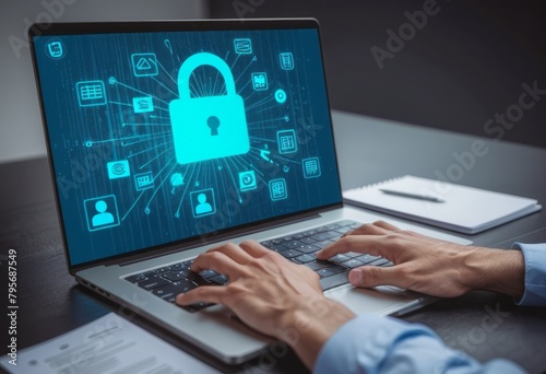 Hands on a laptop displaying a cybersecurity concept with digital lock. Emphasizes online safety and data protection.