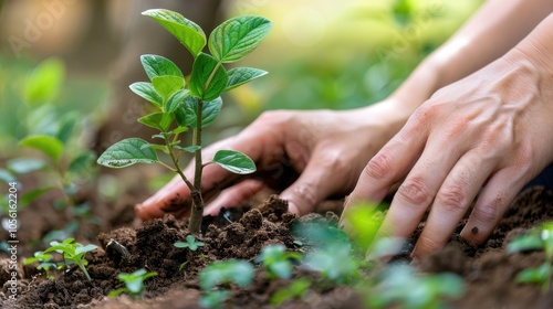 Hands planting young seedling in soil for sustainable gardening and environmental conservation