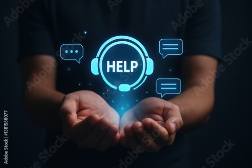 Hands presenting glowing help icon with headset and speech bubbles in dark background.