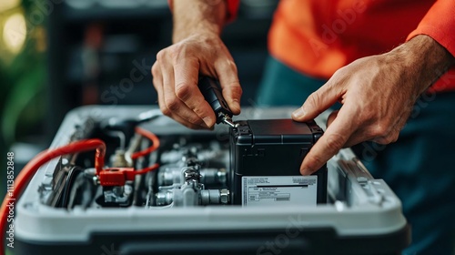 Hands repairing a battery, showcasing professionalism and technical skill in an industrial setting.