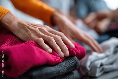 Hands sorting donated clothes or items for distribution, organized effort. Charity, resourcefulness.