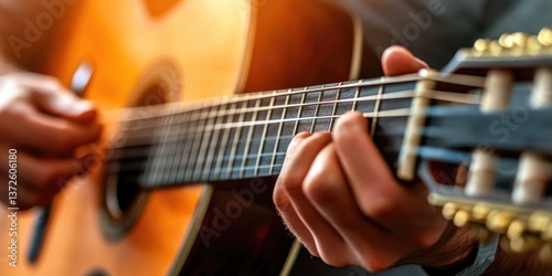hands strumming a guitar, warm indoor lighting and focused expression capture the joy of personal hobbies