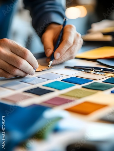 Hands Styling Outfits with Color Palettes and Textures for a Photoshoot on a Table