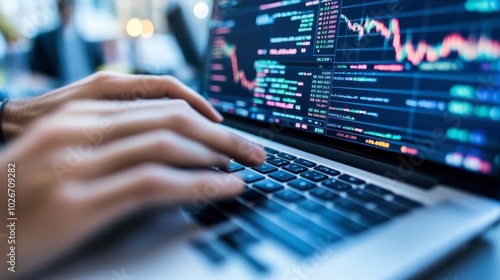 Hands typing on a laptop displaying a stock trading platform, with various charts and market trends visible on the screen.