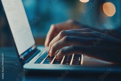Hands Typing on a Laptop in a Dimly Lit Room