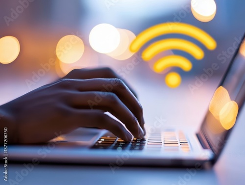 Hands typing on a laptop with a WiFi security audit displayed