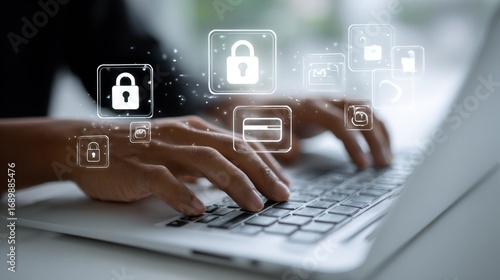 Hands typing on a laptop with security icons floating above the keyboard. Digital safety and online protection are symbolized