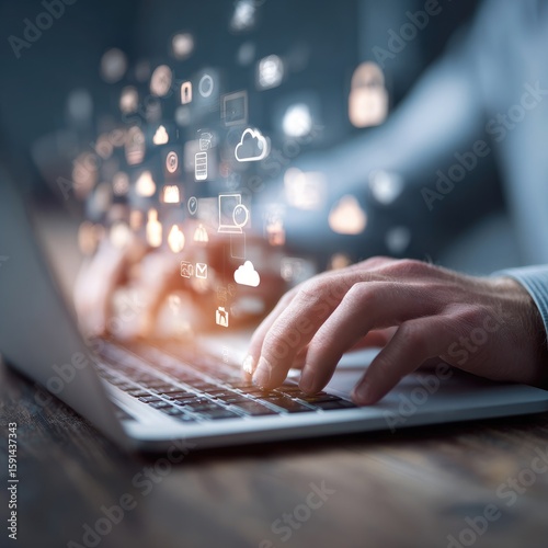 Hands typing on laptop, digital icons floating