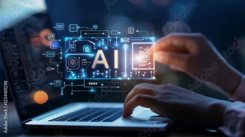 Hands typing on laptop displaying glowing AI interface with futuristic digital network