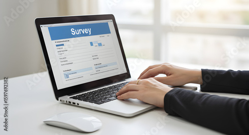 Hands Typing on Laptop Displaying Survey Form on White Desk in Bright Room with Softly Blurred Window and Keyboard Detail