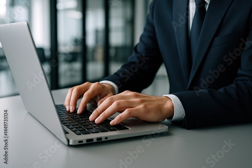 Hands typing on laptop in business suit. professional work, remote tasks and digital communication
