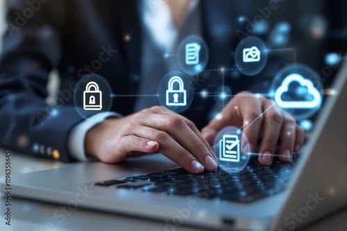Hands typing on laptop keyboard with glowing cybersecurity icons in abstract background.