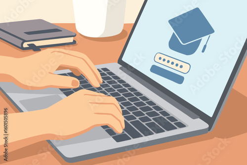 Hands Typing on Laptop Logging into Online Learning Platform Vector Illustration of E-Learning, Digital Education Access, and Remote Study in Modern Flat Style for Educational Technology Concepts