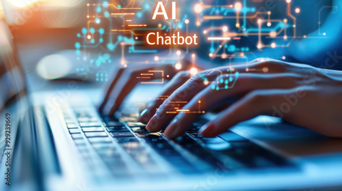 Hands typing on laptop with digital elements showcasing AI and chatbot technology, symbolizing modern communication.