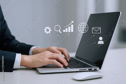 Hands Typing on Laptop with Digital Icons Including Graph Globe and Email.