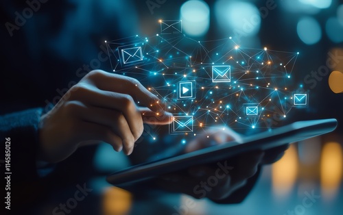 Hands using a tablet with email and message icons floating above, representing the evolution of communication and the role of modern technology