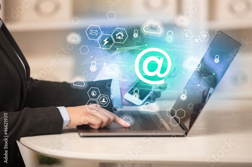 Hands working on laptop with digital icons concept