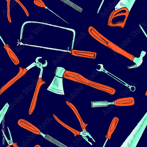 Handsaw, coping saw, chisel, bradawl, hammer, file, screwdriver, wrench, pliers and axe, seamless pattern design, hand drawn doodle, sketch in pop art style, red on dark blue background
