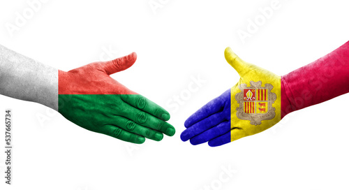 Handshake between Andorra and Madagascar flags painted on hands, isolated transparent image.
