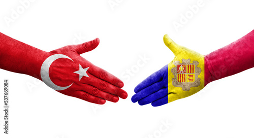 Handshake between Andorra and Turkey flags painted on hands, isolated transparent image.