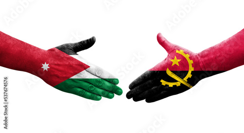 Handshake between Angola and Jordan flags painted on hands, isolated transparent image.
