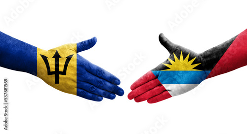 Handshake between Antigua and Barbuda and Barbados flags painted on hands, isolated transparent image.
