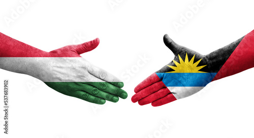 Handshake between Antigua and Barbuda and Hungary flags painted on hands, isolated transparent image.