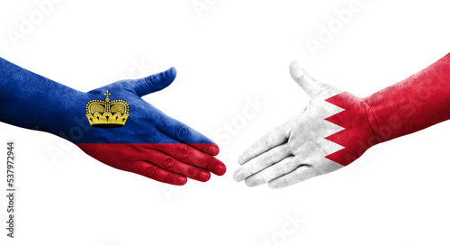 Handshake between Bahrain and Liechtenstein flags painted on hands, isolated transparent image.